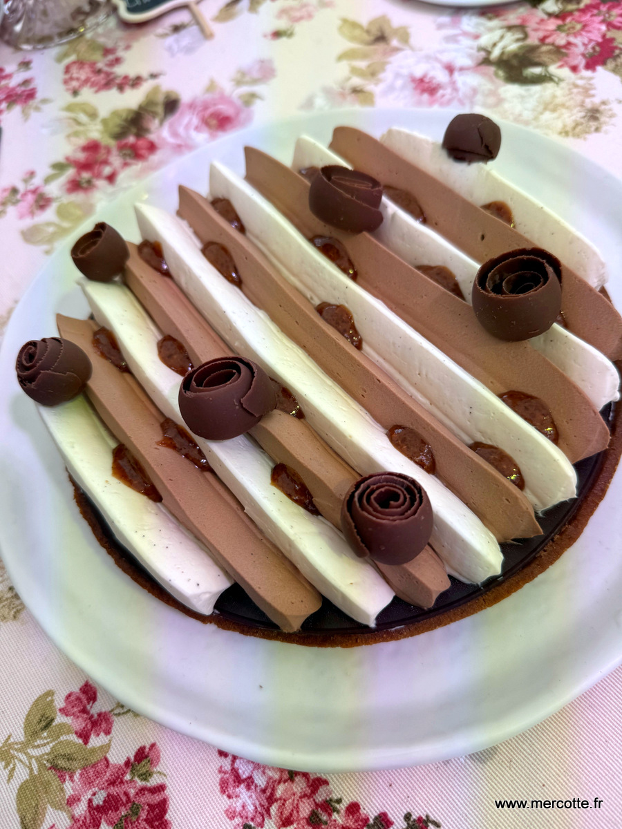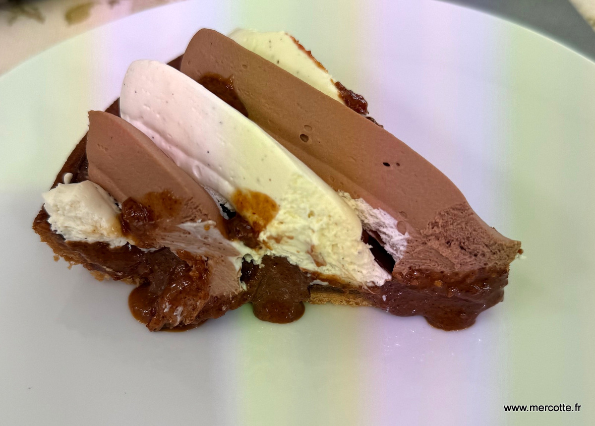 La mousse au chocolat noir : 180g de Caraïbes, 20g de pâte de cacao, 150g de crème fleurette 35%MG (1), 6g de gélatine, 300g de crème fleurette 35 %MG (2).
