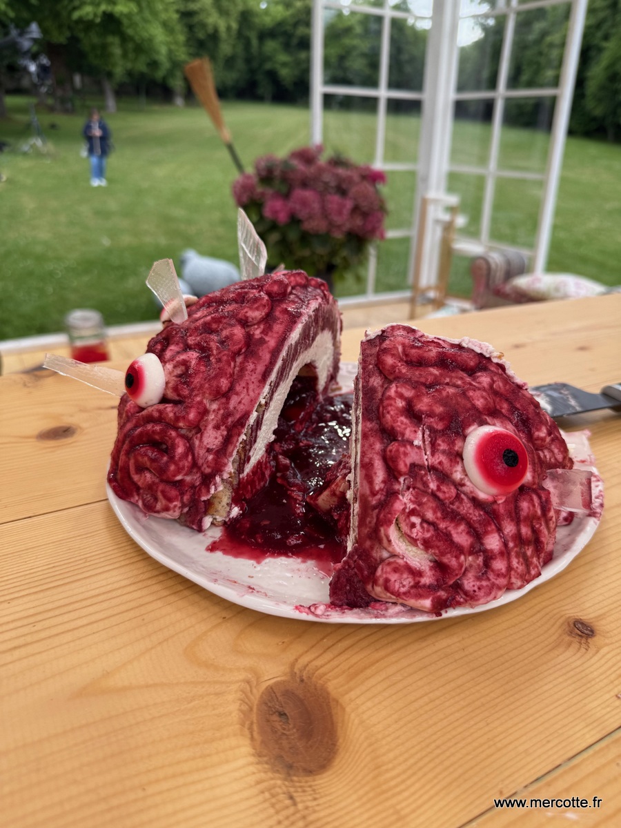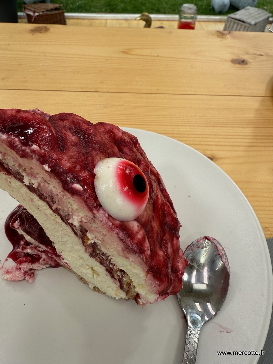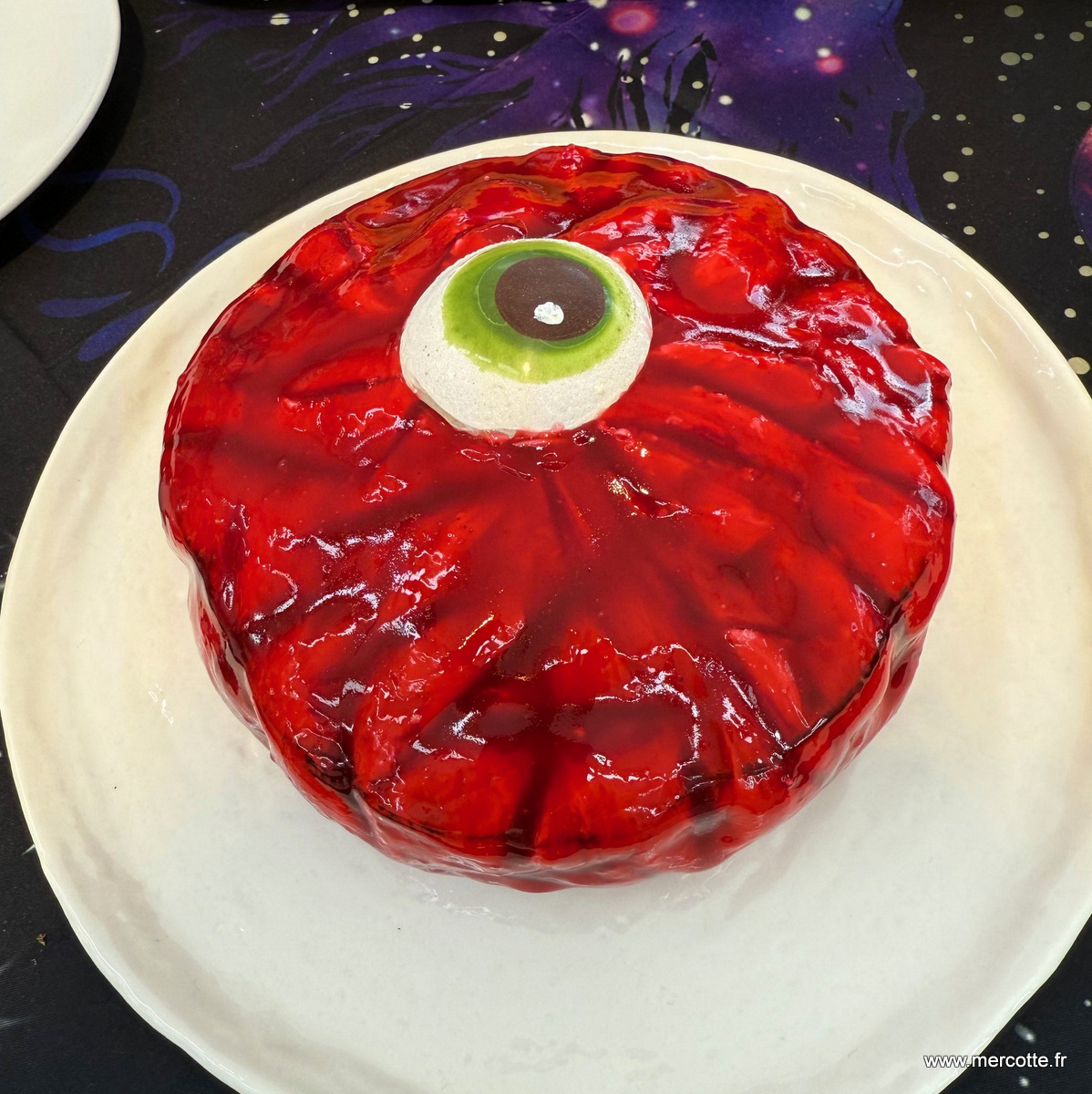 Le terrible gâteau cerveau : il se compose d’un délicieux biscuit viennois monté en tourbillon, d’un croustillant au chocolat blanc, d’une légère ganache montée vanille cardamome dans laquelle on retrouve un sanguinolent coeur coulant de coulis de cerises, emprisonné dans une coque en beurre de cacao. et sur le dessus des yeux en gelée et des éclats de verre en isomalt.