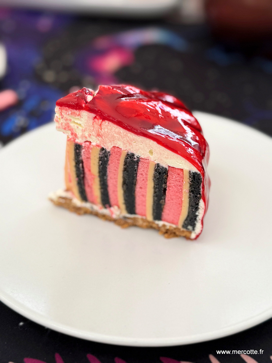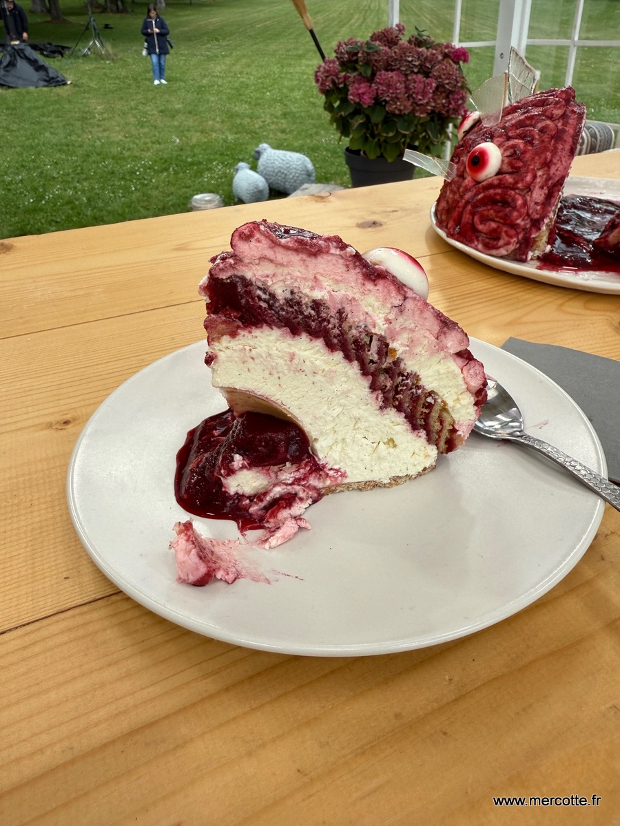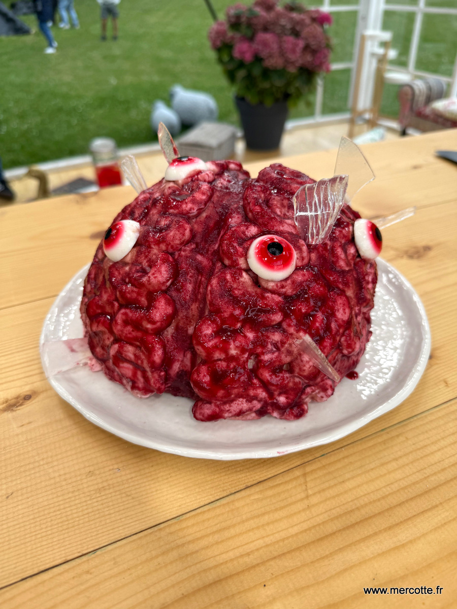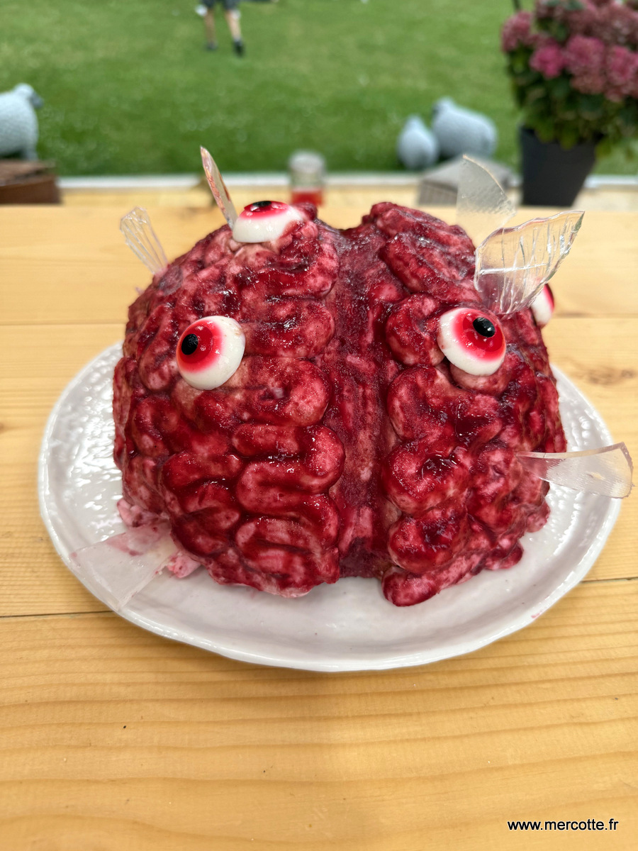 Le terrible gâteau cerveau : il se compose d’un délicieux biscuit viennois monté en tourbillon, d’un croustillant au chocolat blanc, d’une légère ganache montée vanille cardamome dans laquelle on retrouve un sanguinolent coeur coulant de coulis de cerises, emprisonné dans une coque en beurre de cacao. et sur le dessus des yeux en gelée et des éclats de verre en isomalt.