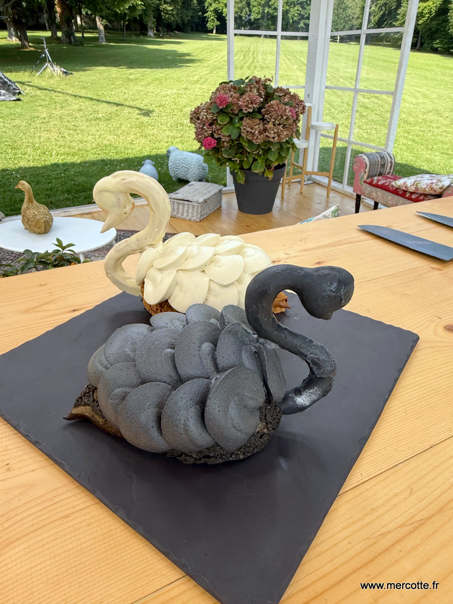 Dans une casserole, chauffer l’eau, le lait entier, le beurre, le sel et le sucre. Hors du feu, ajouter la farine et mélanger. Remettre sur le feu et sécher la pâte 2min. Débarrasser dans la cuve du robot. Ajouter les oeufs entiers en trois fois en mélangeant avec la feuille. Diviser la pâte en deux, colorer une pâte en noir avec le charbon végétal. Pocher 3 corps de cygnes de chaque couleur. Avec l’emporte-pièce 3cm pocher une grande goutte de (13cmx8cm), avec la douille 15mm pocher une moyenne goutte (7cmx4cm) et un petit rond (chou de 2cm). Pocher avec la douille 6mm un cou de chaque couleur avec la tête en forme de S de 14cm, tête de 2cm et finir en formant un bec. Poser le craquelin à la taille des 3 corps (gros, moyen et petit). Cuire à 185° : cou 20min, le corps chou et corps moyen 40min, le gros corps 50min. L’idée est de pocher les cous sur la même plaque, les corps moyens et petits choux sur lune autre plaque et les grands corps ensemble sur la 3e plaque ce qui permet de les sortir en même temps.