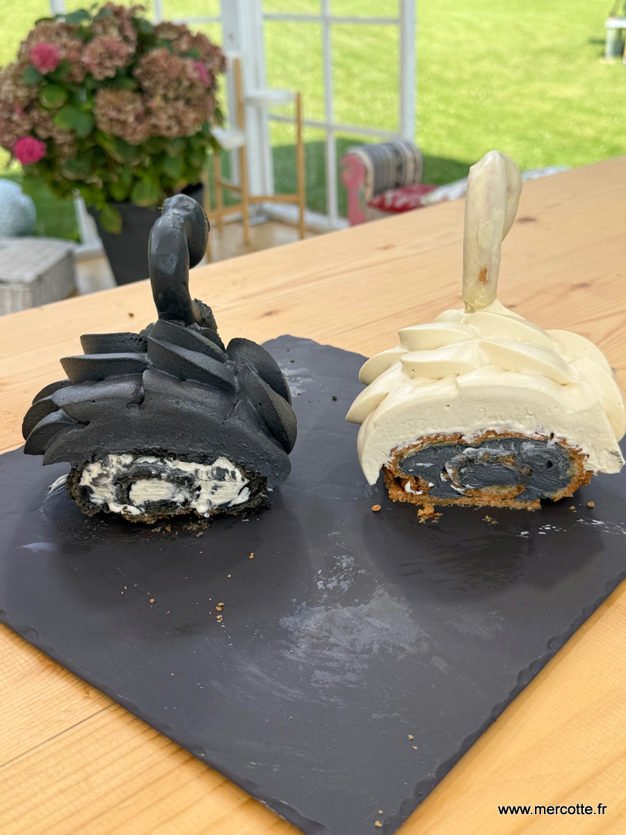 Le montage : retirer le dessous des corps gros et moyens. Garnir en tapissant le grand et moyen chou noir de ganache montée sésame blanc. Garnir le petit chou noir de praliné sésame blanc. Garnir la tête noire de praliné sésame blanc. Emboiter le petit chou dans le corps moyen. Emboiter le corps moyen dans le gros chou. Poser sur le croustillant sésame noir. Garnir en tapissant le grand et moyen chou blanc de ganache montée sésame noir. Garnir le petit chou blanc de praliné sésame noir. Garnir la tête blanche de praliné sésame noir. Emboiter le petit chou dans le corps moyen. Emboiter le corps moyen dans le gros chou Poser sur le croustillant sésame blanc. Pocher à l’aide de la douille St Honoré un plumage blanc sur le gros corps blanc avec la ganache montée sésame blanc. Pocher à l’aide de la douille St Honoré un plumage noir sur le gros corps noir avec la ganache montée sésame noir. A l’aide d’un couteau, former un trou à l’avant du corps (partie non pointue de la goutte) et enfoncer la tête noire dans le corps noir et la tête blanche dans le corps blanc.
