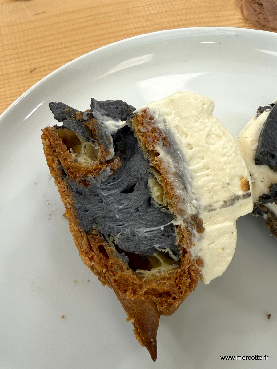 La pâte à choux : 125g d’eau, 125g de lait entier, 110g de beurre, 5g de sel, 5g de sucre, 135g de farine T55, 250g d’oeufs pesés sans la coquille, 4g de charbon végétal.