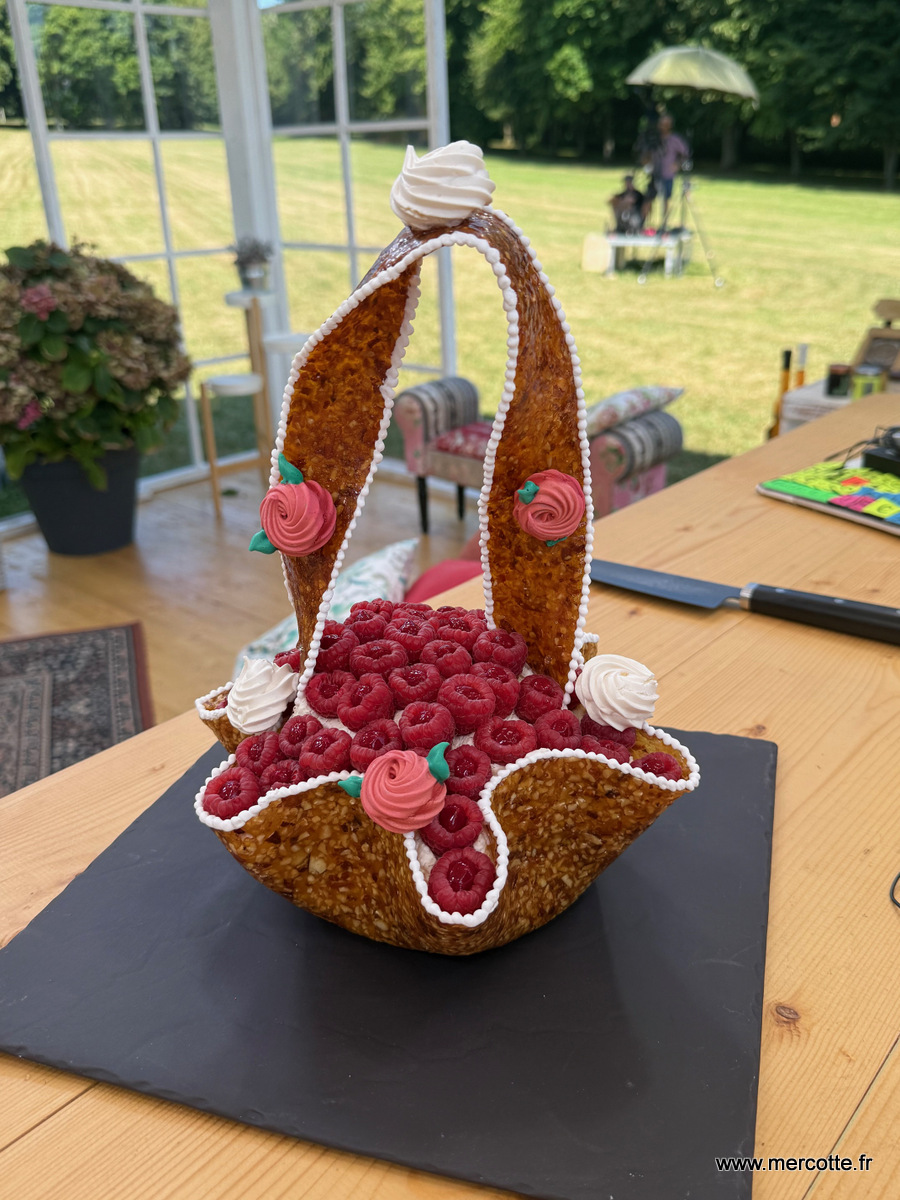 Une épreuve technique de haut vol pour ces quarts de finale, la périlleuse et délicieuse tulipe hollandaise à la framboise : les pâtissiers doivent réaliser un magnifique panier et son anse torsadée en nougatine… le tout garni d’une ganache légère, surmontée de dizaines de framboises ! L’exploit est de faire apparaître à la coupe une framboise géante en coulis… de framboise.