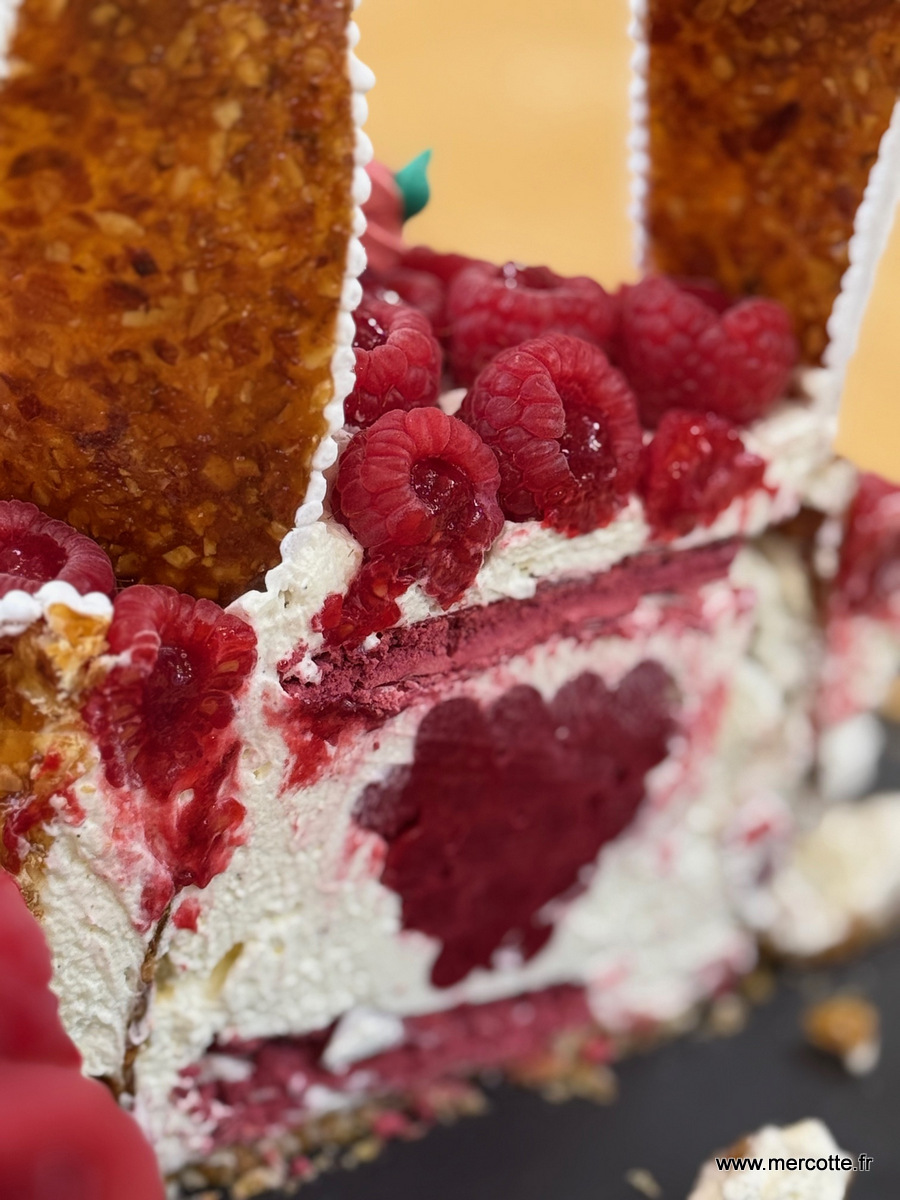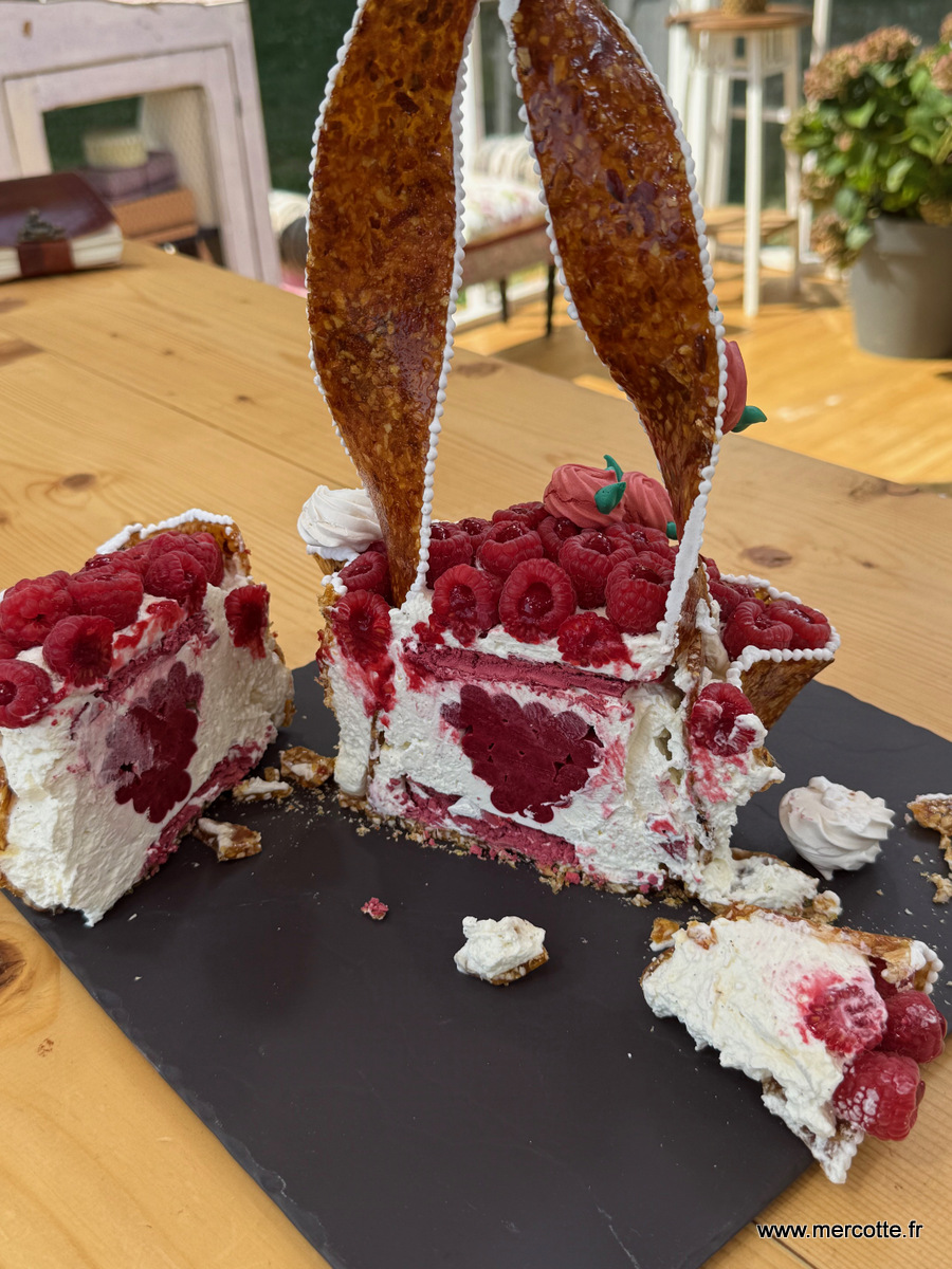 Le montage : dans le fond du panier pocher une couche de chantilly vanille. Poser un disque de meringue chablonné. Pocher une couche de chantilly vanille. Poser au centre la framboise en compotée dans le sens inverse de l’anse. Pocher de la chantilly vanille. Poser un disque de meringue chablonné. Pocher de la chantilly vanille en formant un dessus un peu bombé. Poser des framboises sur toute la surface du panier. Garnir chaque framboise de compotée framboise. Coller 2 meringues blanches sur les framboises avec la glace royale. Coller 2 meringues couleur framboise sur les contours du panier. Coller 2 meringues couleur framboise sur l’anse . Coller 1 meringue blanche sur l’anse.